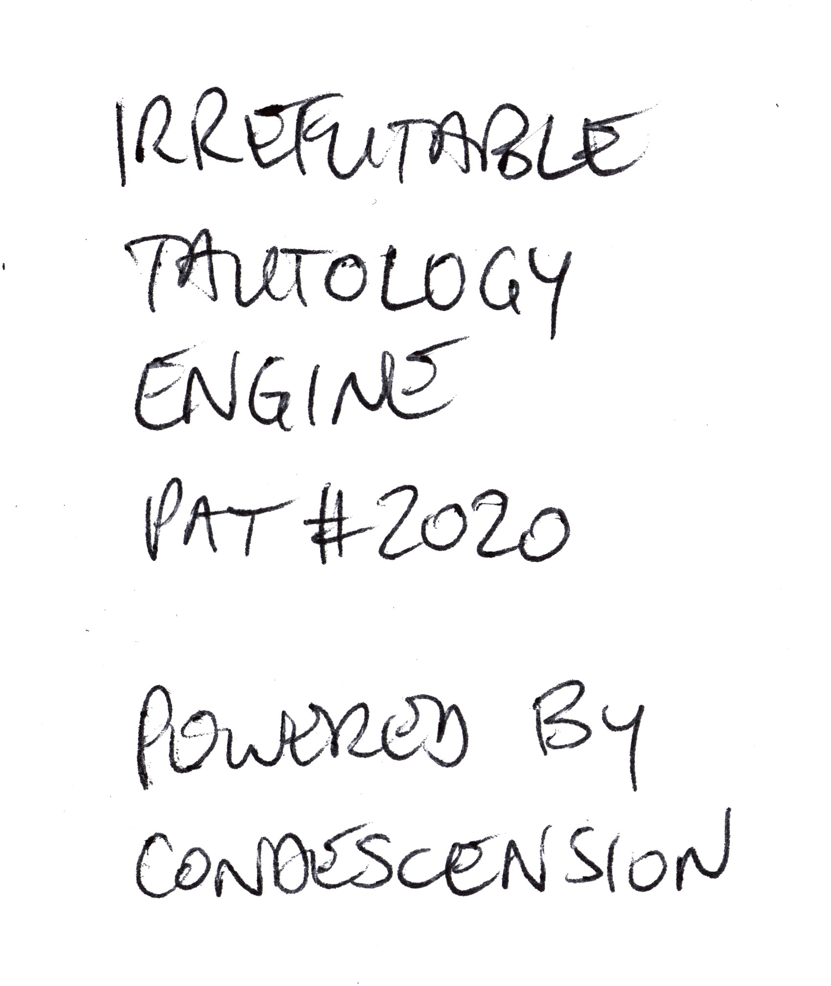 The Irrefutable Tautology Engine is a new drive for vehicles to lower their emissions. It is powered by the same "hypothesis...see I told you so" technology that has fueled social media, and gossip, in the centuries before the internet was invented, since the dawn of time.